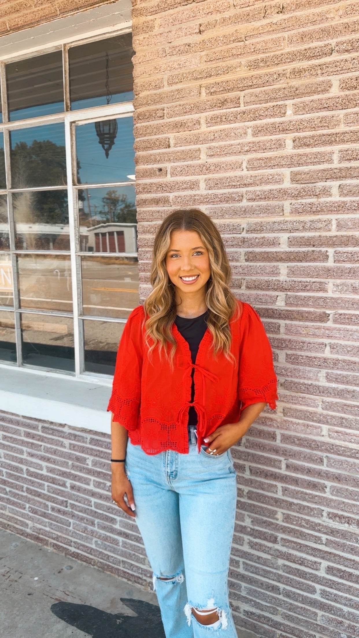 Floral Embroidery Tie Front Blouse